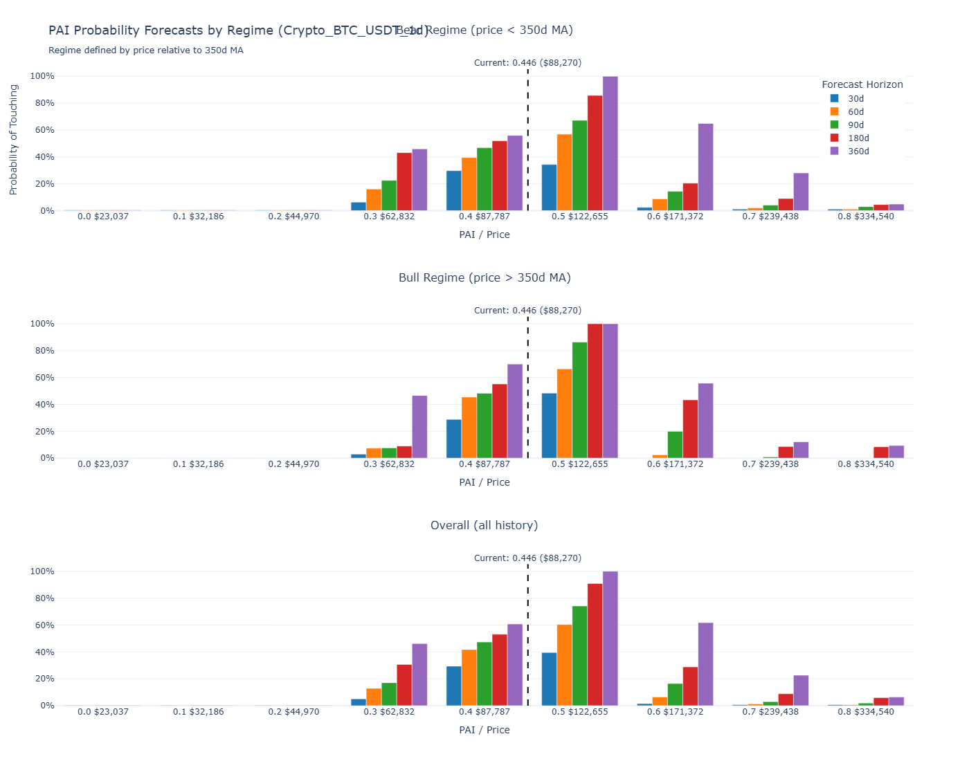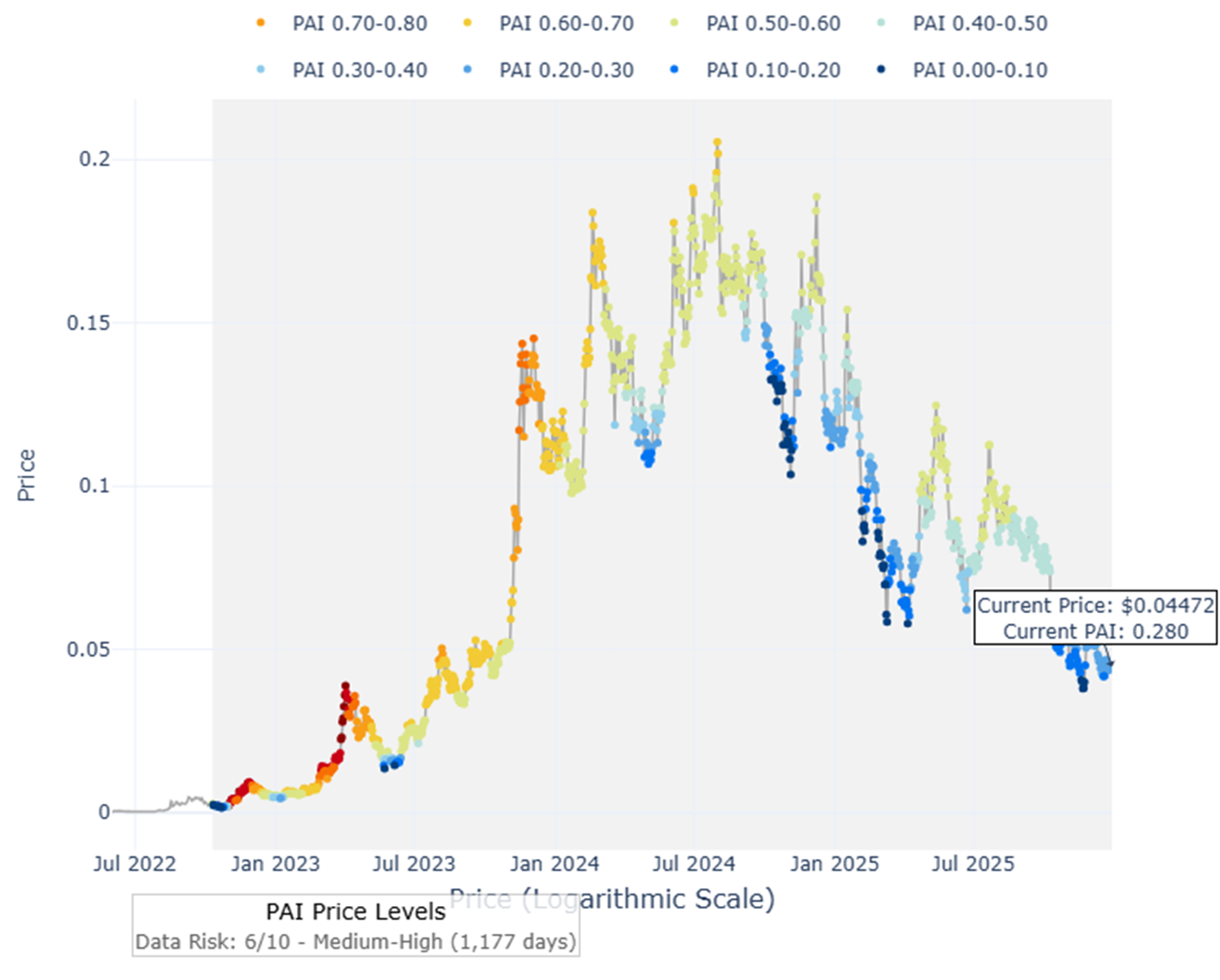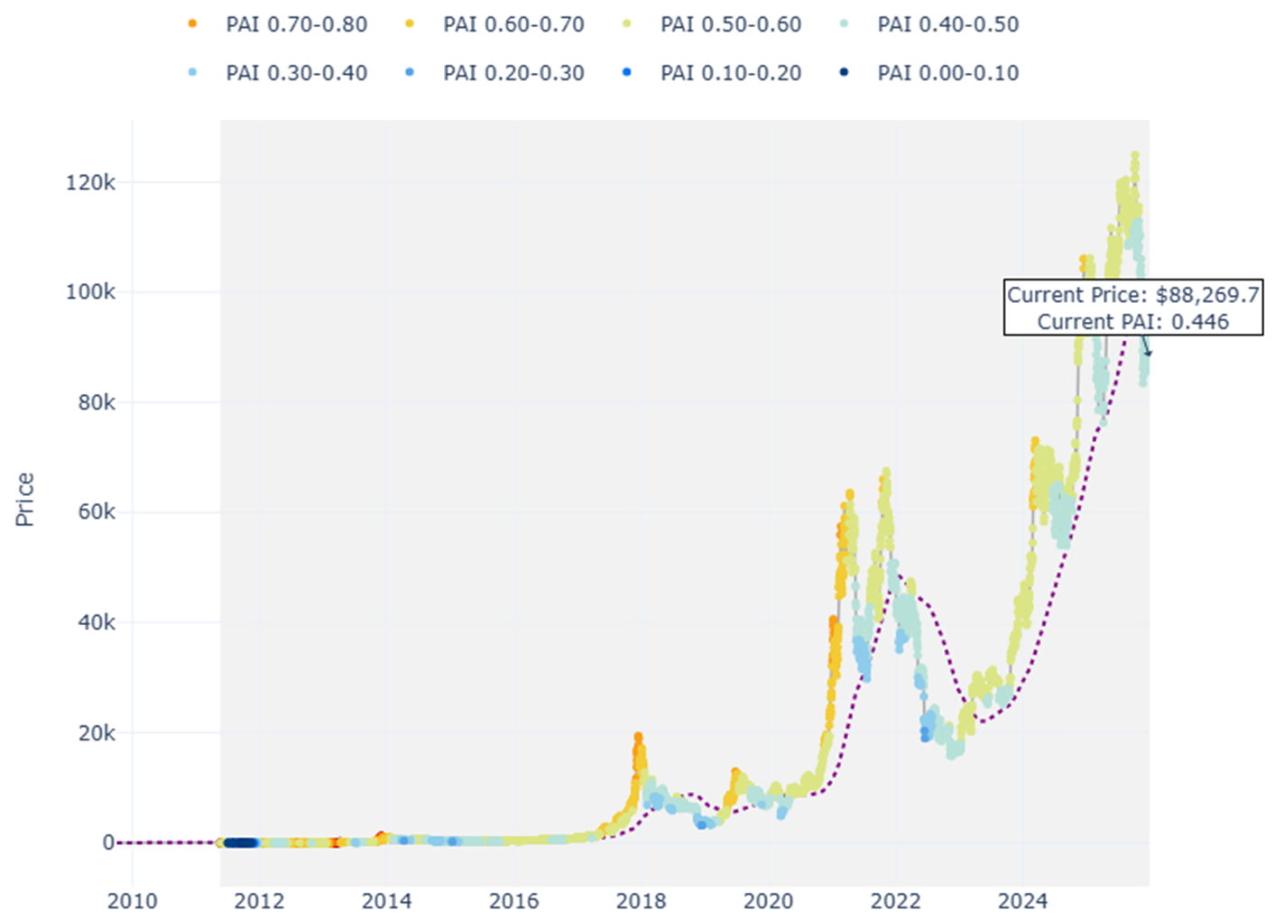 Figure 2: Bitcoin PAI and Price Levels. The current PAI of 0.45 indicates we are in "neutral" territory, not deep value.