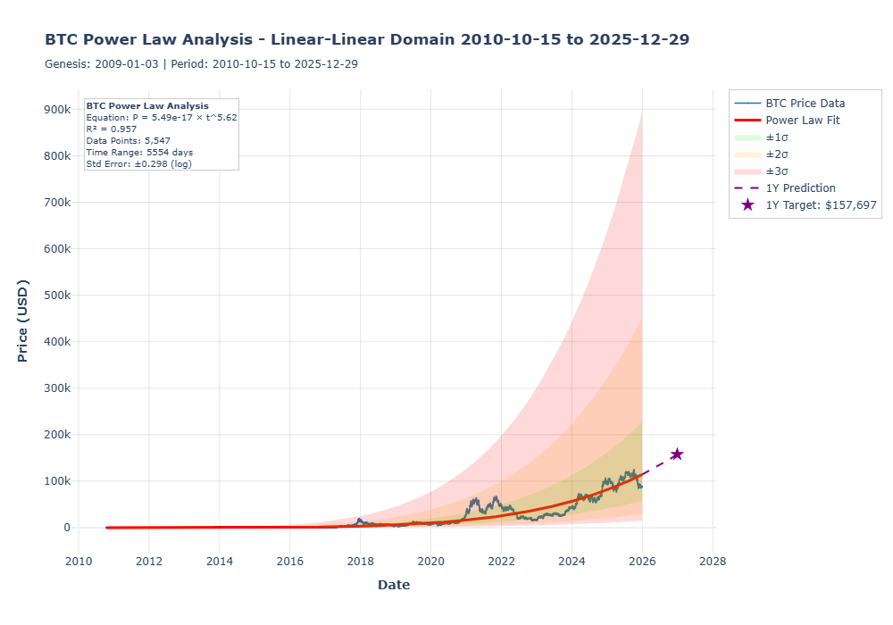 If we assume the future mimics the past, the Power Law gives us a "directional vector." The model suggests a 1-year target of approximately $158,000. However, just because the trend points there, doesn't mean we will get there in a straight line.