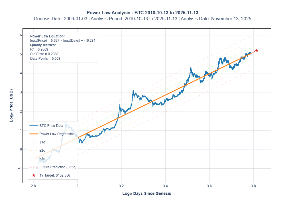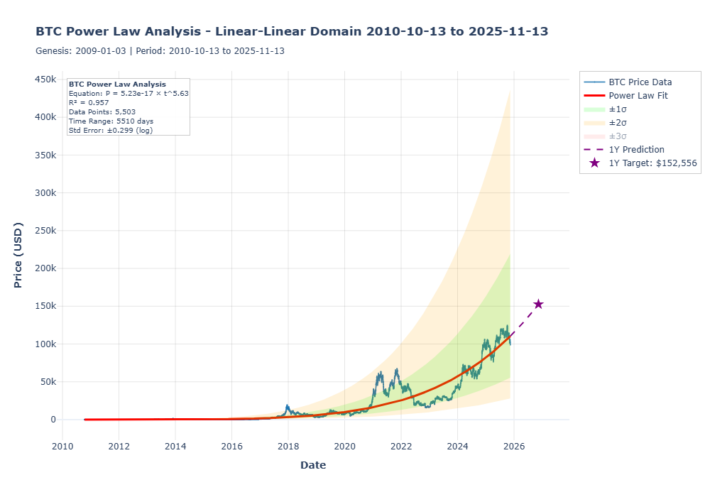 Furthermore, if we simply stay on this trendline, the Power Law projects a target of $152,556 one year from now. Even if the chaotic "four-year cycle" is dead, a simple reversion to the mean offers a significant upside.