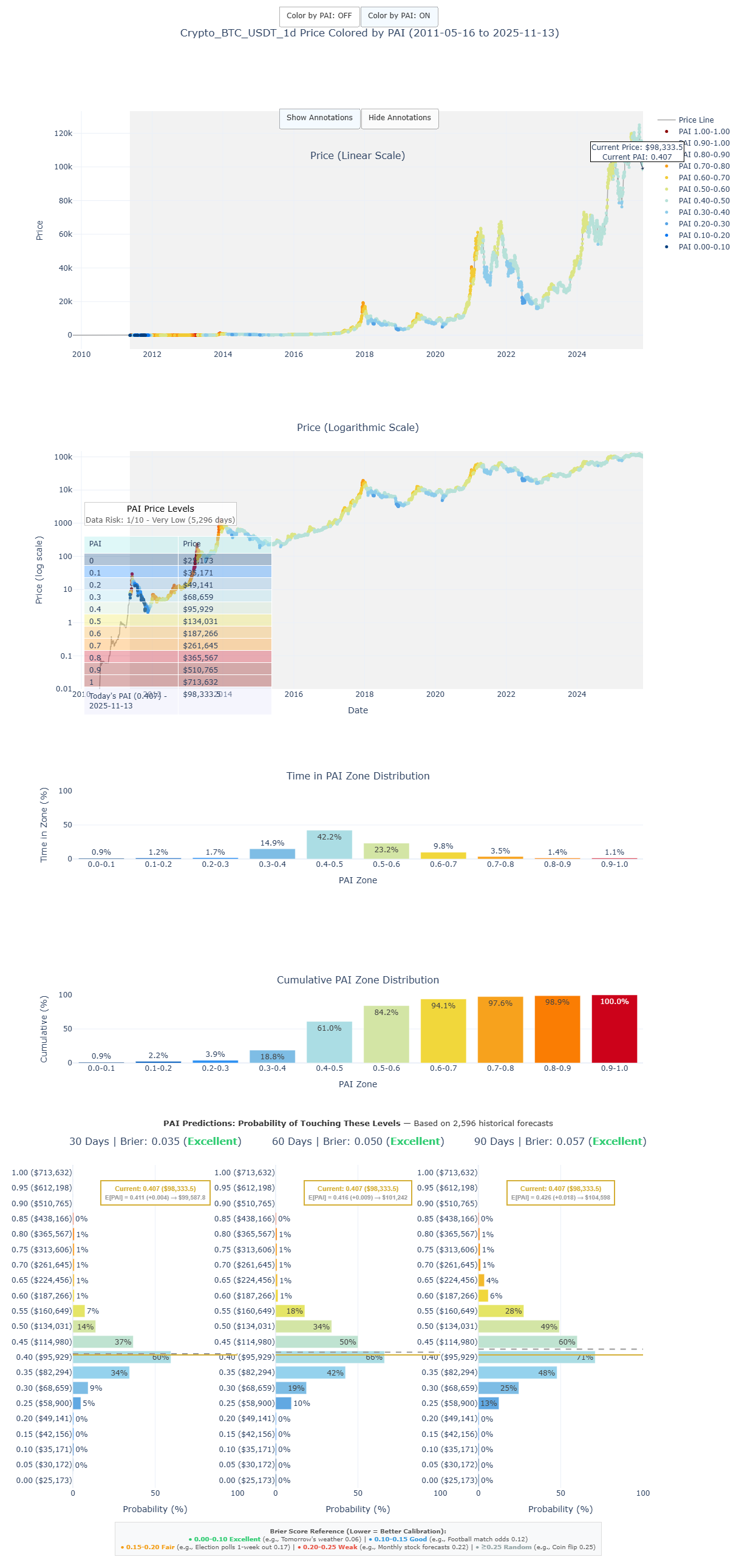My PAI system has been validated across over 50,000 forecasts with a Brier score of 0.05 for Bitcoin, an "Excellent" rating on par with professional weather forecasting. It is a robust, data-driven engine.