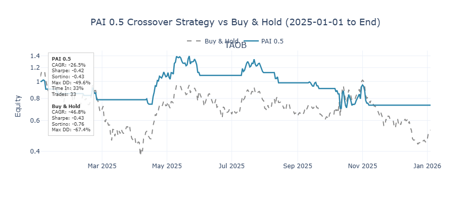 Instead, we can use a Momentum Strategy: buying when the asset proves strength by crossing the 0.5 PAI threshold, and selling if it drops back below it.
