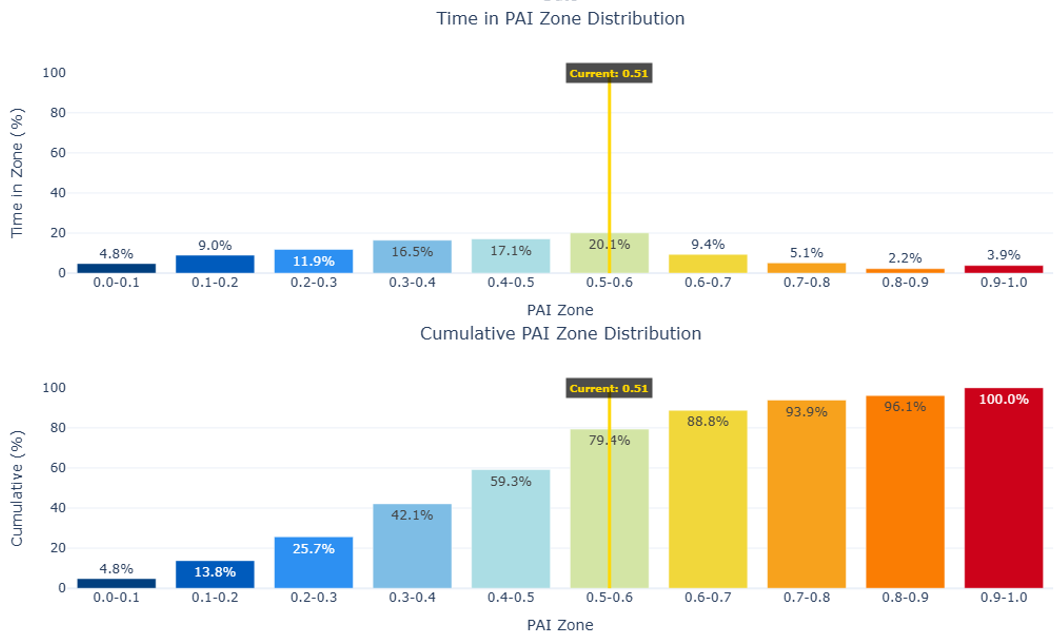 The histogram below shows the "Time in Zone." Historically, TAO has spent about 60% of its life at a PAI lower than where we are today.