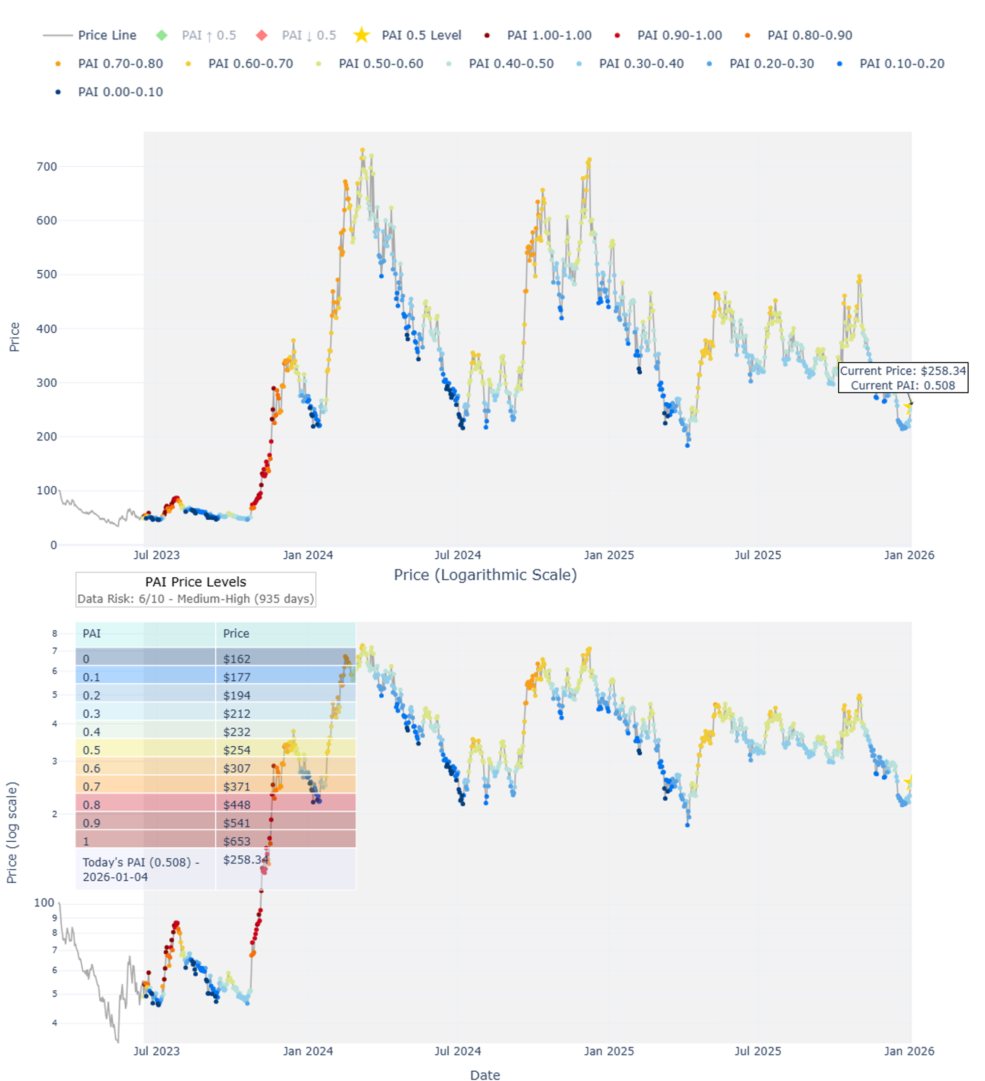 - Entry: Current levels ($258 range), as we are above the 0.5 PAI signal.